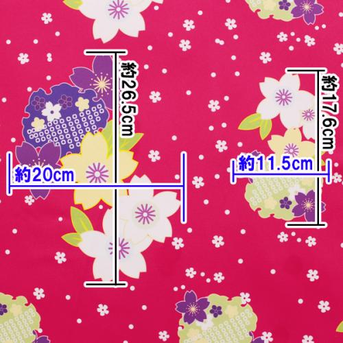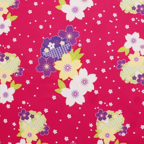赤紫色のベースに白、黄、紫の和風花柄プリント生地です。